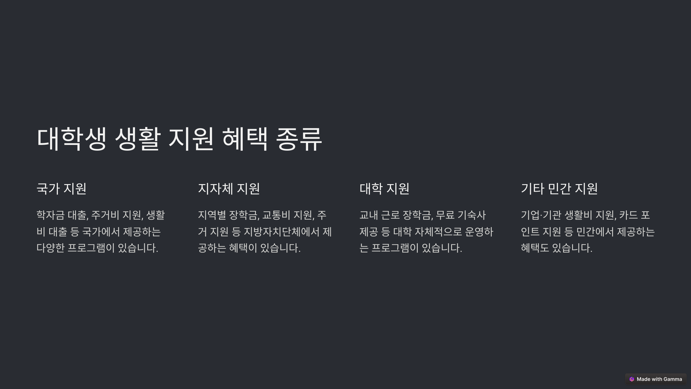 대학생이 받을 수 있는 생활 지원 혜택은 크게 국가 지원, 지자체 지원, 대학 지원, 기타 민간 지원으로 나눌 수 있습니다.